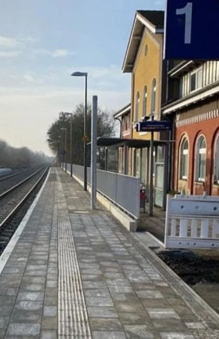 Bahnsteig mit Gleisen und einem Schild mit der Nummer 1 neben einem Gebäude an einem Bahnhof